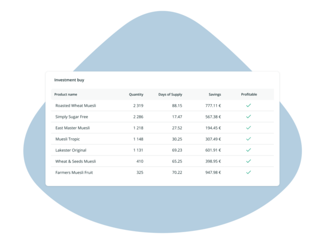 Reaprovisionamiento automatizado y optimizado según los objetivos de nivel de servicio, la demanda prevista, los plazos de entrega, los tamaños de lote de los pedidos disponibles, los costes de manipulación, el riesgo de obsolescencia, las restricciones de los pedidos de los proveedores y la necesidad de llenar camiones o contenedores.