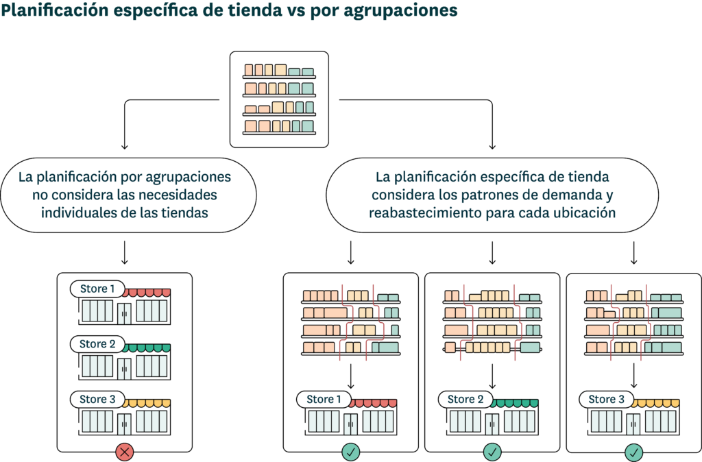 Pero planificar a nivel agrupación puede dar lugar a varios problemas, ya que cada tienda tiene patrones de demanda, espacios y capacidades únicos. Lo ideal sería que los retailers diseñaran planogramas que se ajustaran al espacio de cada tienda y a la demanda local. Los beneficios de la planificación del espacio específico de cada tienda son considerables.