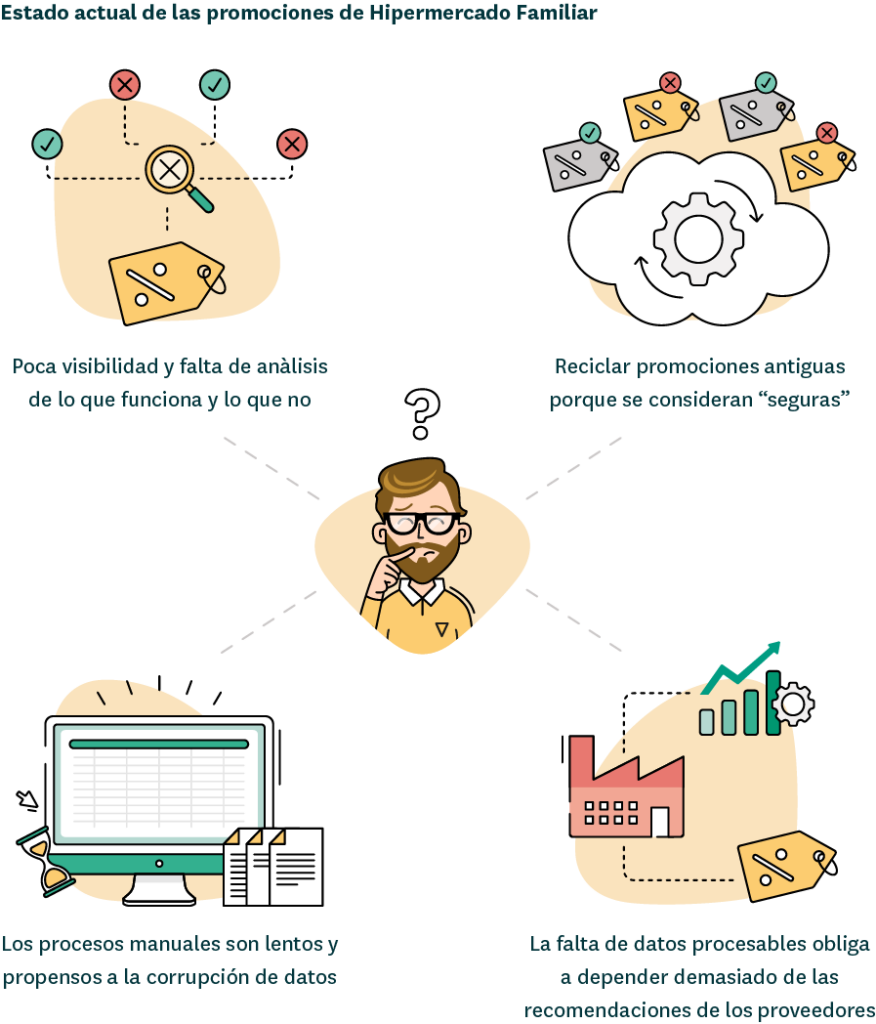 El equipo está atascado en un ciclo basado en implementar las mismas promociones cada año porque no dispone de tiempo ni de datos procesables. Hipermercado Familiar no posee las herramientas adecuadas para identificar y desarrollar nuevas ideas para promociones que sean prometedoras, por lo que las campañas de los años anteriores se perciben como la opción «más segura». Además, los procesos manuales requieren tanta dedicación que el equipo no dispone de más tiempo para desarrollar nuevas campañas. Como resultado, alrededor del 95 % de las promociones se copian año sí, año también.