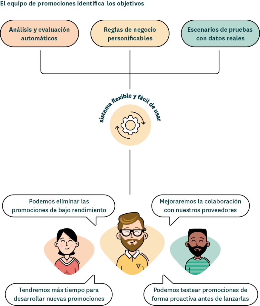 Los proveedores tienden a ser los principales impulsores del desarrollo de promociones. Los proveedores de bienes de consumo de Hipermercado Familiar comprenden mejor los datos y los datos procesables; además, sugieren futuras promociones y ofertas de forma proactiva. Puesto que sus capacidades internas para analizar y optimizar las promociones son limitadas, el equipo de Hipermercado Familiar no tiene otra opción que confiar plenamente en las recomendaciones de estos proveedores.