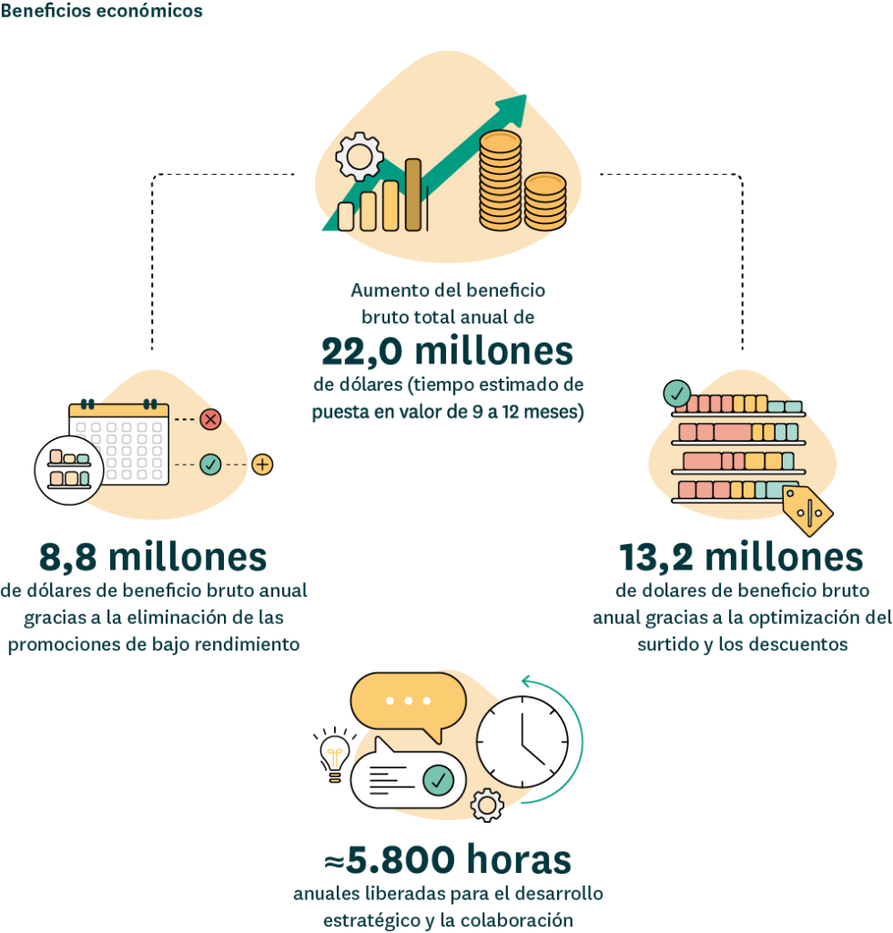 El equipo dispone de poca información sobre el rendimiento de las promociones en las diferentes tiendas de Hipermercado Familiar o sobre cómo rinden unas con respecto a otras. Matthew quiere implementar un sistema que proporcione evaluaciones automatizadas de las promociones a nivel de tienda y que permita compararlas a lo largo del año. Estos análisis proporcionarán al equipo lo que necesita para maximizar los resultados de las promociones, con información de qué promociones impulsan las ventas y los márgenes, qué promociones pasadas deben descartarse por su bajo rendimiento y qué productos deben incluirse en los surtidos promocionales, así como los precios óptimos. Descartar promociones de bajo rendimiento también ahorra tiempo, que se puede invertir en desarrollar nuevas campañas y estrategias.