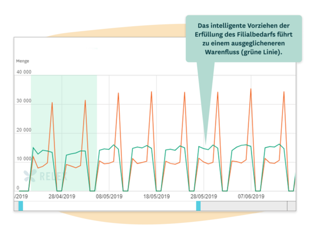 RELEX gleicht Warenflüsse automatisch aus. So werden Kapazitätsengpässe entschärft, die Auslastung optimiert und eine effektive Nutzung der Ressourcen gewährleistet – ohne das Risiko von Out-of-Stocks oder Verderb zu erhöhen.