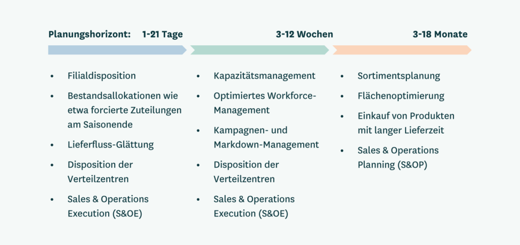 Der S&OE-Prozess soll sicherstellen, dass Einzelhändler die kurzfristige Nachfrage, für den Zeitraum der kommenden null bis drei Monate, so kosteneffizient wie möglich erfüllen. Ausgangspunkt ist eine sehr detaillierte Absatzprognose auf SKU-Kanal-Tagesebene (siehe Abschnitt 2.1). Von dieser ausgehend können Planer Supply-Chain-Projektionen verwenden, um ein detailliertes Verständnis des Bestands-, Kapazitäts- und Ressourcenbedarfs in der gesamten Lieferkette zu erhalten.