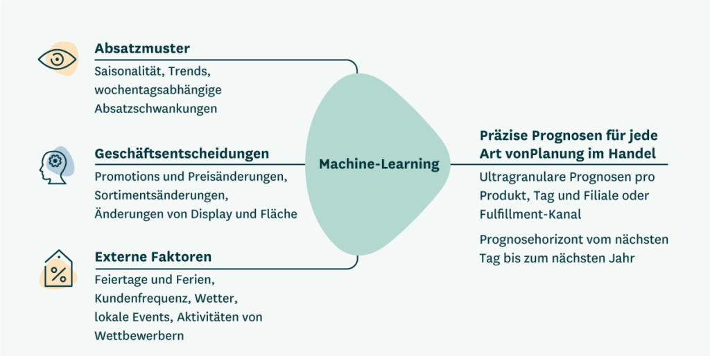 Maschinelles Lernen ermöglicht es, eine Vielzahl von Faktoren und Beziehungen in die Prognosen einzubeziehen, die den Absatz beeinflussen. Dies ist enorm wertvoll, da allein Wetterdaten Hunderte verschiedener Faktoren enthalten können, die sich auf den Absatz auswirken.