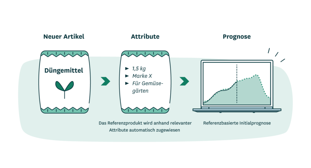 Bei der Einführung eines neuen Produkts besteht der gängigste Ansatz darin, ihm ein Referenzprodukt zuzuweisen, das als Blaupause für sein Absatzmuster dient, bis es genügend eigene Verkaufsdaten gesammelt hat. Es ist viel effizienter, ein System zu verwenden, das automatisch Produktattribute (zum Beispiel Produktgruppe, Marke, Packungsgröße, Farbe oder Preispunkt) vergleichen kann, um das relevanteste Referenzprodukt zuzuordnen. Natürlich können Sie den gleichen Ansatz anwenden, um geeignete Referenzfilialen für Neueröffnungen zu finden.