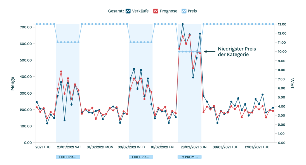 Oft hat auch die Preisgestaltung eines Produkts im Verhältnis zu anderen Produkten in seiner Kategorie einen großen Einfluss. In vielen Kategorien wird das Produkt mit dem niedrigsten Preis überproportional nachgefragt. Die Machine-Learning-basierte Absatzprognose berücksichtigt die Preisposition eines Produkts auf unkomplizierte Weise, wie in Abbildung 6 unten dargestellt.