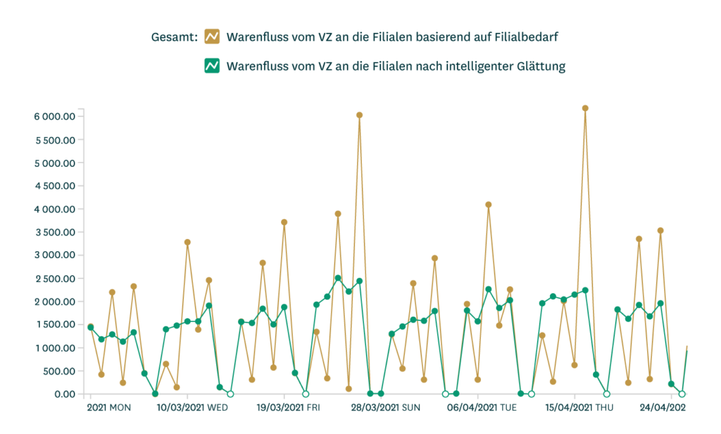 Abbildung 8 (unten) zeigt, wie ein modernes Planungssystem den Warenfluss in Ihren Verteilzentren und Filialen selbstständig glättet, so das Risiko von Engpässen verringert und eine effiziente Auslastung der Kapazitäten gewährleistet.
