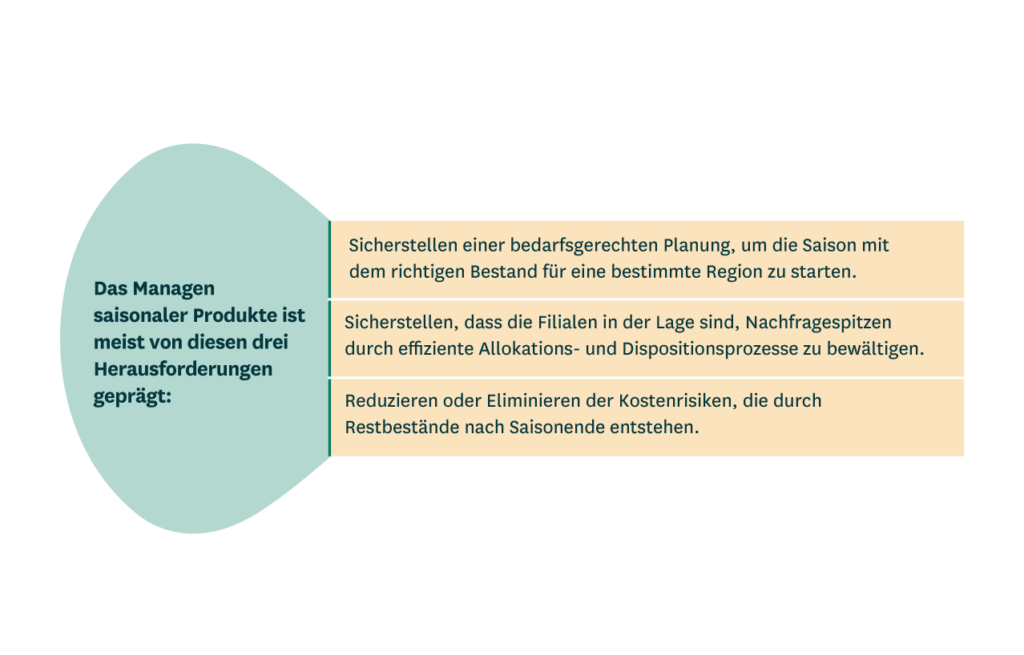 In der Regel beginnt das Vorbereiten auf eine Hauptsaison neun bis 15 Monate vor Saisonbeginn: Einzelhändler legen ihre Verkaufsziele fest und definieren ihr saisonales Sortiment entsprechend. Dann muss die Menge der zu beschaffenden Waren festgelegt werden, um den Verkaufsplan umzusetzen. Des Weiteren wird der Zeitpunkt bestimmt, zu dem diese Waren bestellt und an die Filialen und Verteilzentren geliefert werden müssen, um die Bestände vor Saisonbeginn hochzufahren. Beginnt eine Saison früher als üblich, müssen Einzelhändler zudem in der Lage sein, flexibel darauf zu reagieren.
