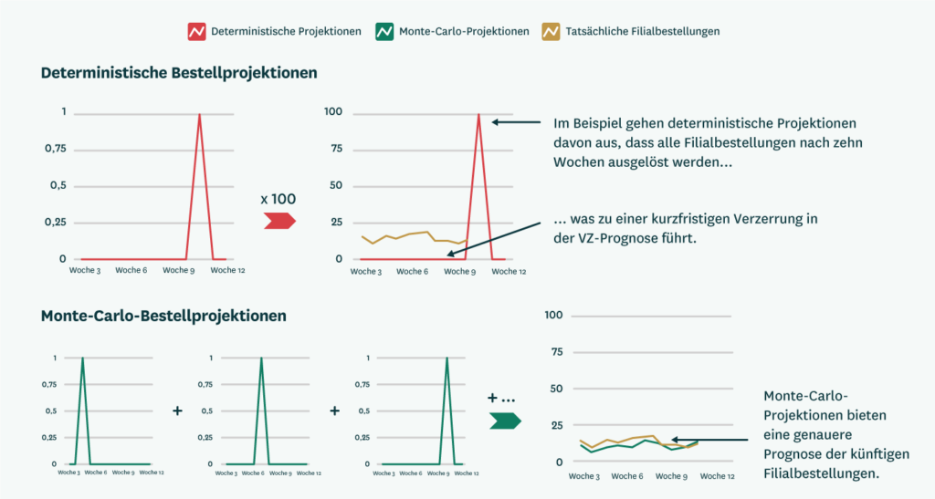 Um die erwarteten Auffüllbestellungen für Langsamdreher zeitlich realistischer zu verteilen, bietet sich ein Modellierungsansatz an, der „Monte-Carlo-Simulation“ genannt wird. Für die einzelne Filiale ergibt sich daraus kein Unterschied – sie muss weiterhin die gleiche Menge des Sicherheitsbestands vorhalten, um die Verfügbarkeit zu gewährleisten. Auf Ebene des Verteilzentrums wird die Prognosegenauigkeit von Langsamdrehern jedoch signifikant verbessert.