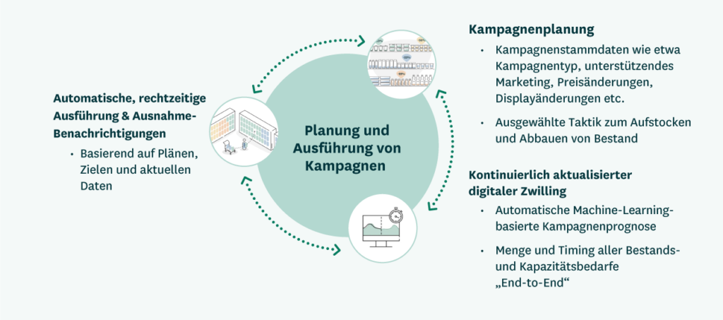 - Funktionsübergreifende Abstimmung: Transparenz macht die Auswirkungen von Geschäftsentscheidungen, die von einer Funktion getroffen werden, sofort für alle Funktionen verfügbar und einplanbar. Beispielsweise wird die erwartete Wirkung einer geplanten Kampagne sofort in allen lokalen Absatzprognosen sowie den Projektionen von Bestand und Ressourcen in der gesamten Supply-Chain berücksichtigt. Dies bedeutet, dass Geschäftsentscheidungen wie Promotions nur einmal geplant werden müssen, bevor sie automatisch ausgeführt werden können.