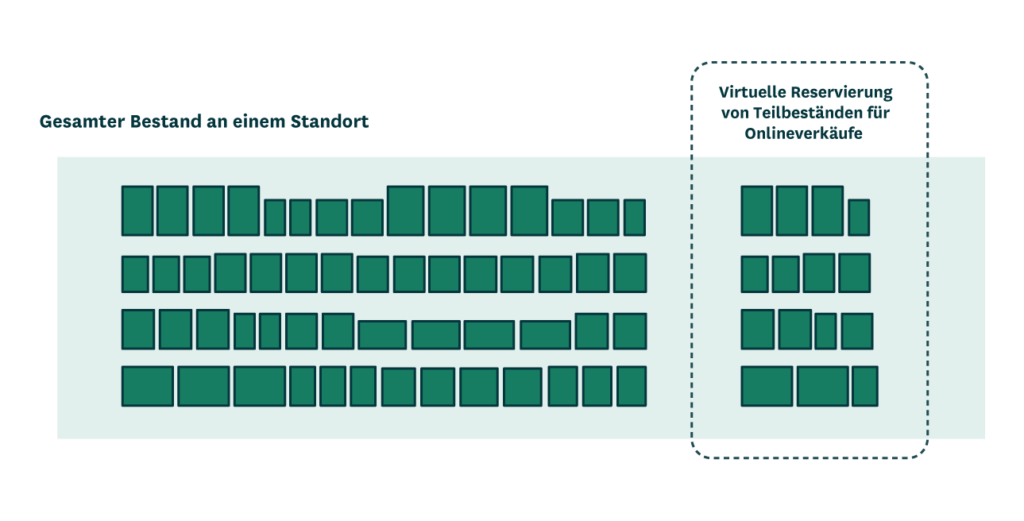 Der effizienteste Weg, um sowohl die Nachfrage in den Filialen als auch die Online-Nachfrage zu befriedigen, besteht darin, Bestellungen aus demselben zentralen Bestandspool in Ihren Verteilzentren zu erfüllen. Best Practice zur Gewährleistung der Verfügbarkeit über alle Kanäle hinweg: Reservieren Sie einen Teil des Bestands in Ihrem Verteilzentrum. Dieser Bestand ist zweckgebunden und nur für den Online-Verkauf bestimmt. Diese Strategie wird auch virtuelles „Ringfencing“ (Umzäunung) genannt.
