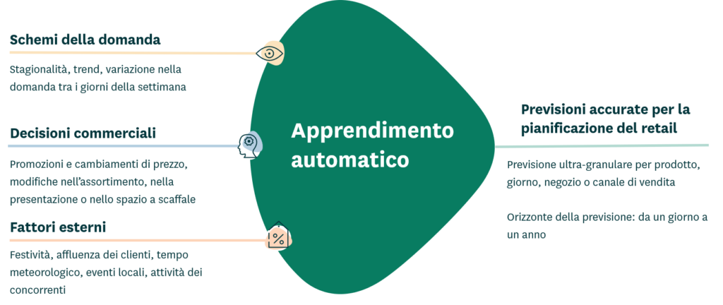 Il machine learning conferisce a un sistema di previsione la possibilità di apprendere automaticamente e migliorare le proprie previsioni utilizzando solo i dati, senza necessità di programmazione aggiuntiva. Poiché i retailer generano enormi quantità di dati, la tecnologia di apprendimento automatico permette risultati rapidi. Quando un sistema di apprendimento automatico riceve dei dati – più sono, meglio è – va in cerca di modelli da utilizzare in futuro per prendere decisioni migliori.