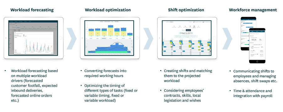 - Optimization of shifts on a detailed level to match them to the workload at 15-minute intervals each day and allocate the tasks to the most suitable employees based on their profiles.