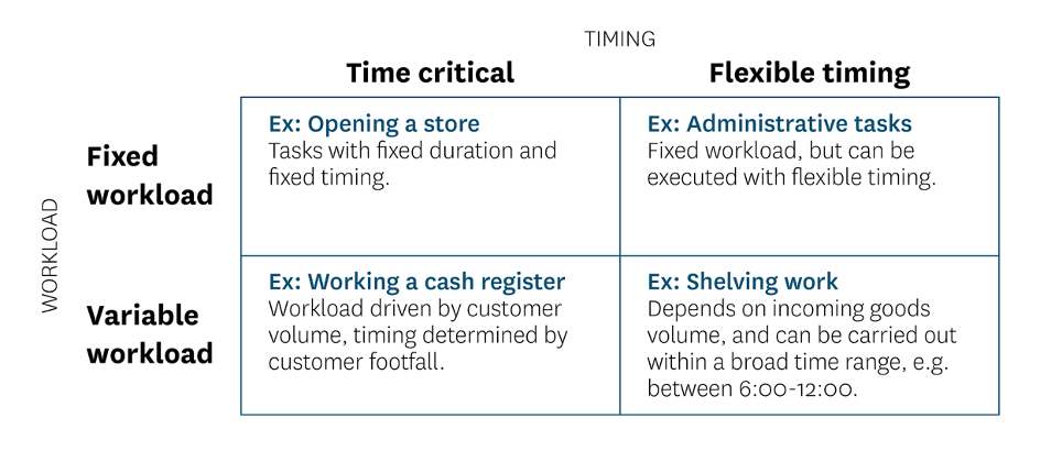 An automated system should be able to understand each type of task. For example, opening the store happens at the same time every day and requires the same workload every time, making it easy to schedule. But shelving work is typically forecast on day level, is more flexible in nature, and can be optimized to minimize unnecessary slack throughout the day. Cashier work, on the other hand, needs to happen in accordance with customer footfall, so volume will fluctuate, depending on the peaks in the customer flow.