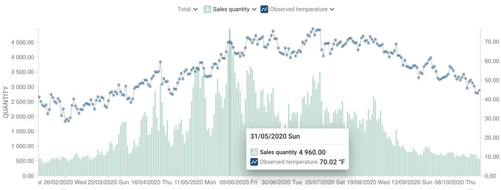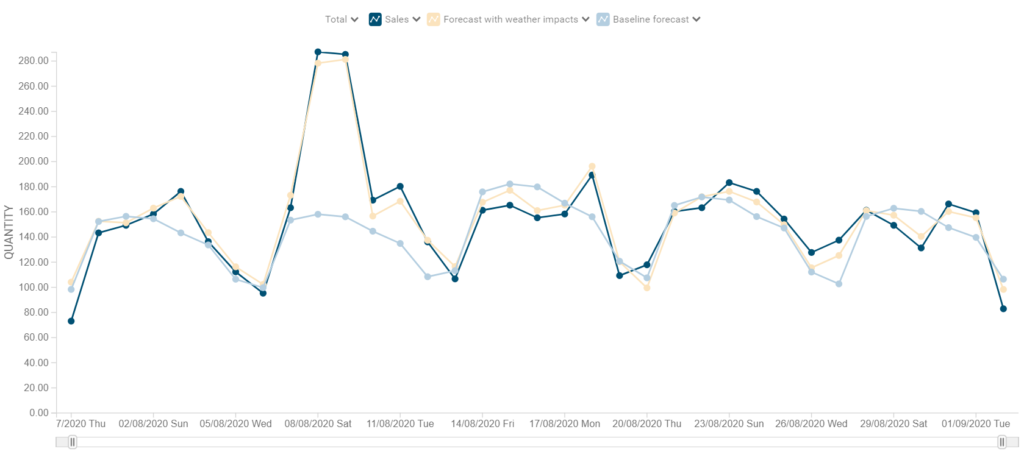 Este reto es demasiado intenso en datos y cálculos como para poder ser abordado por un equipo de planificación de forma manual. Los retailers tienen que recurrir al software de previsión de la demanda basada en inteligencia artificial para procesar enormes conjuntos de datos y ejecutar una enorme cantidad de cálculos. Sólo entonces pueden definir automáticamente las relaciones entre todos los factores meteorológicos que potencialmente tienen un efecto sobre la demanda a un nivel granular, día-producto-tienda.