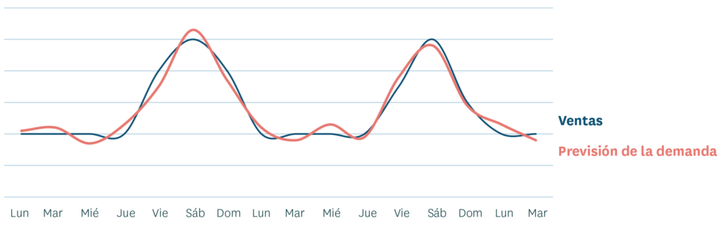 El modelo de series temporales es un enfoque probado y válido que puede entregar buenos pronósticos para patrones recurrentes, como los cambios en la demanda relacionados con los días de la semana o las estaciones. En nuestra experiencia, los pronósticos de demanda basados en el aprendizaje automático entregan consistentemente un nivel de precisión más alta que los modelos de series temporales. Mientras que los modelos de series temporales simplemente aplican patrones pasados a la demanda futura, el aprendizaje automático va más allá al intentar definir la relación real entre las variables (como los días de la semana) y sus patrones de demanda asociados.