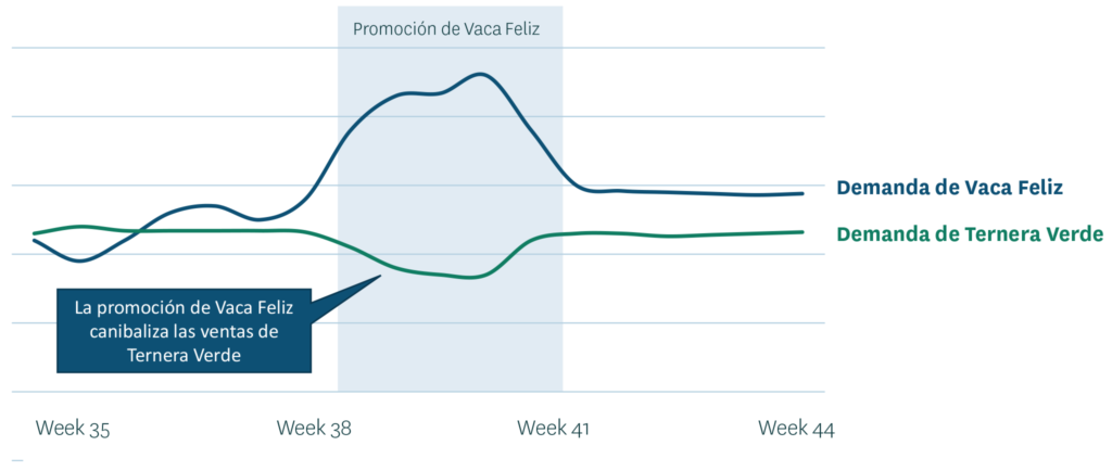 La canibalización de ventas, el fenómeno que hace que el aumento por promoción de un producto cause una disminución en las ventas de otros productos de la misma categoría, es bastante común y también ha de tenerse en cuenta al hacer las previsiones, especialmente para los productos frescos. Por ejemplo, si un supermercado tiene dos marcas de carne de ternera picada orgánica – Vaca Feliz y La Ternera Verde – debería esperar que una promoción del producto Vaca Feliz haga que la compre más gente. Pero como resultado, parte de la demanda de La Ternera Verde se irá a Vaca Feliz. Si el pronóstico de demanda de los productos Ternera Verde no se reduce con precisión, el retailer tiene un gran riesgo de sobre stock que finalmente acabará en mermas..