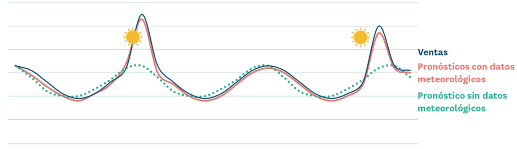 Los factores externos como la meteorología, conciertos y actividades deportivas locales, y cambios de precio de la competencia pueden tener un impacto significativo en la demanda, pero son difíciles de tener en cuenta en los pronósticos sin un sistema que automatice una gran cantidad del trabajo. A nivel general, el impacto puede ser bastante intuitivo. Durante un día cálido, es muy probable que aumenten las ventas de helados, mientras que en la temporada de lluvias, se verá un aumento de la demanda de paraguas, etc.