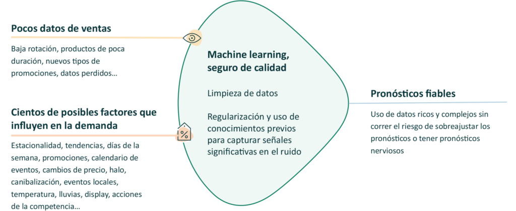 El aprendizaje automático posibilita que al pronóstico de retail se le pueda incorporar la gran variedad de factores y relaciones que afectan la demanda a diario. Esto tiene una gran importancia, ya que sólo los datos meteorológicos por sí solos pueden estar compuestos por cientos de factores que potencialmente, pueden impactar en la demanda. Los algoritmos de machine learning generan automáticamente modelos de mejora continua usando solamente los datos que se les proporciona, ya sean de nuestro negocio o de flujos de datos externos. El principal beneficio es que un sistema como éste puede procesar conjuntos de datos a escala retail desde una variedad de fuentes, todo sin intervención humana.