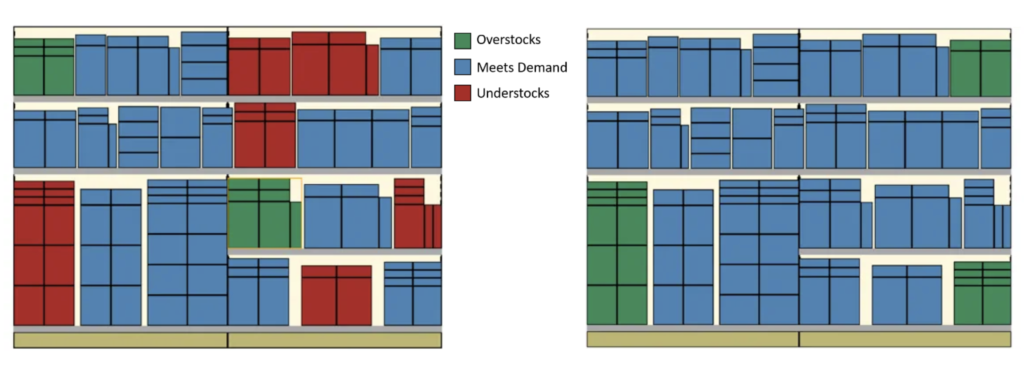 Incluso cuando el espacio coincide, depender de los promedios para la planogramación significará que se produzcan más situaciones de escasez o exceso de stock de las que se producirían con planogramas optimizados de tienda. Es vital que se reduzcan estas ineficiencias y asegurar que el inventario se ajusta para que se llene con precisión cada espacio según la demanda del cliente, ya que puede variar incluso dentro de una misma zona geográfica pequeña.