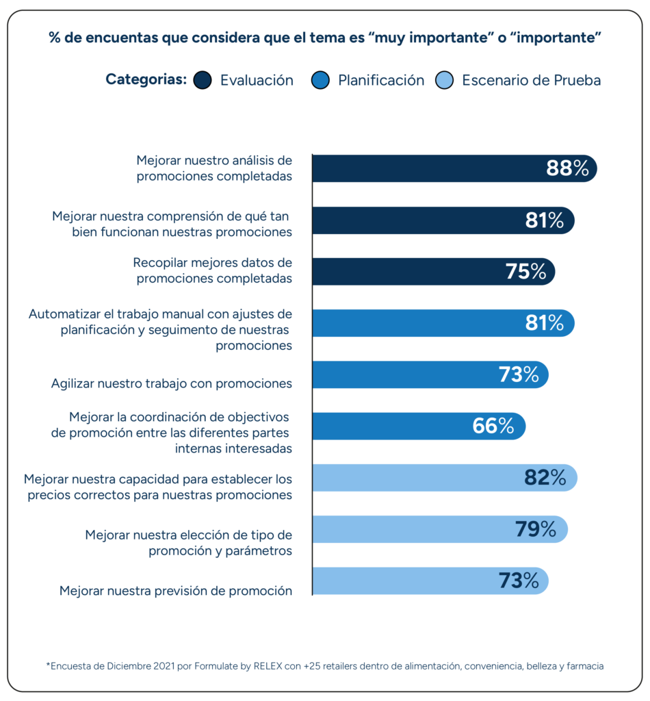 - Los retailers identifican la evaluación, la planificación y las pruebas de escenarios como sus principales áreas de desafío para la gestión de promociones.