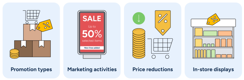 - Promotion types, such as price reduction or multi-buys.
