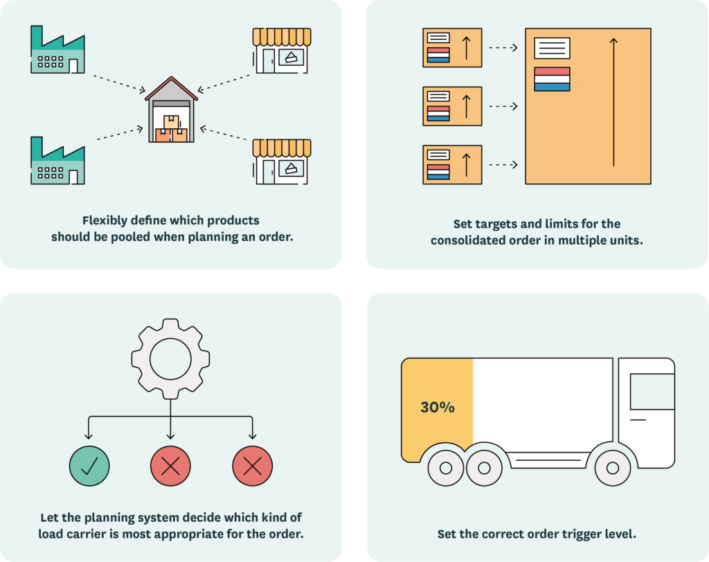 - Set the correct order trigger level. When supplier order restrictions are difficult to meet, it may make sense to require enough demand for at least 30% of a truckload before the planning system starts building an order that fills up the entire load carrier.