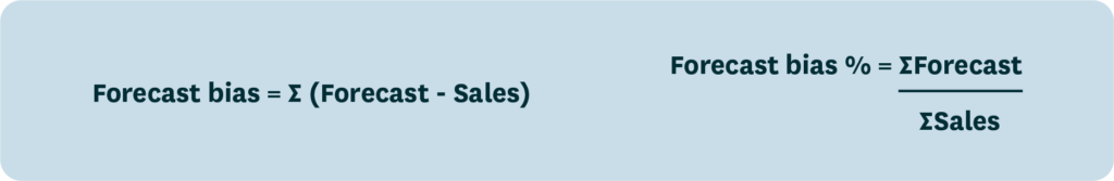 Forecast bias is the difference between forecast and sales. If the forecast over-estimates sales, the forecast bias is considered positive. If the forecast under-estimates sales, the forecast bias is considered negative. If you want to examine bias as a percentage of sales, then simply divide total forecast by total sales – results of more than 100% mean that you are over-forecasting and results below 100% that you are under-forecasting.