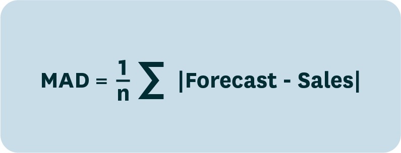Mean absolute deviation (MAD) is another commonly used forecasting metric. This metric shows how large an error, on average, you have in your forecast. However, as the MAD metric gives you the average error in units, it is not very useful for comparisons. An average error of 1,000 units may be very large when looking at a product that sells only 5,000 units per period, but marginal for an item that sells 100,000 units in the same time.